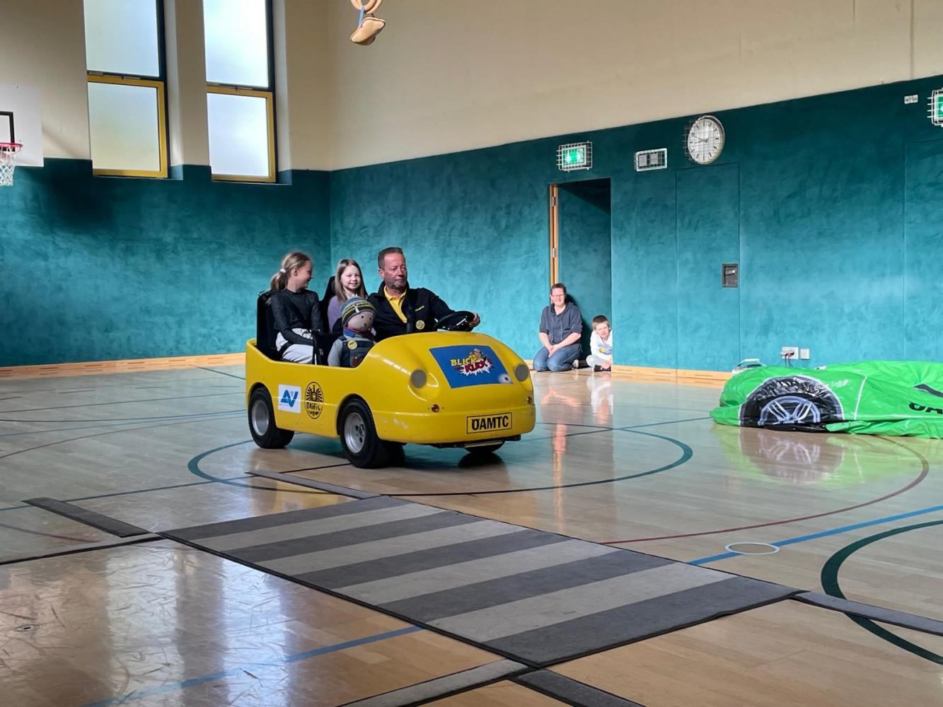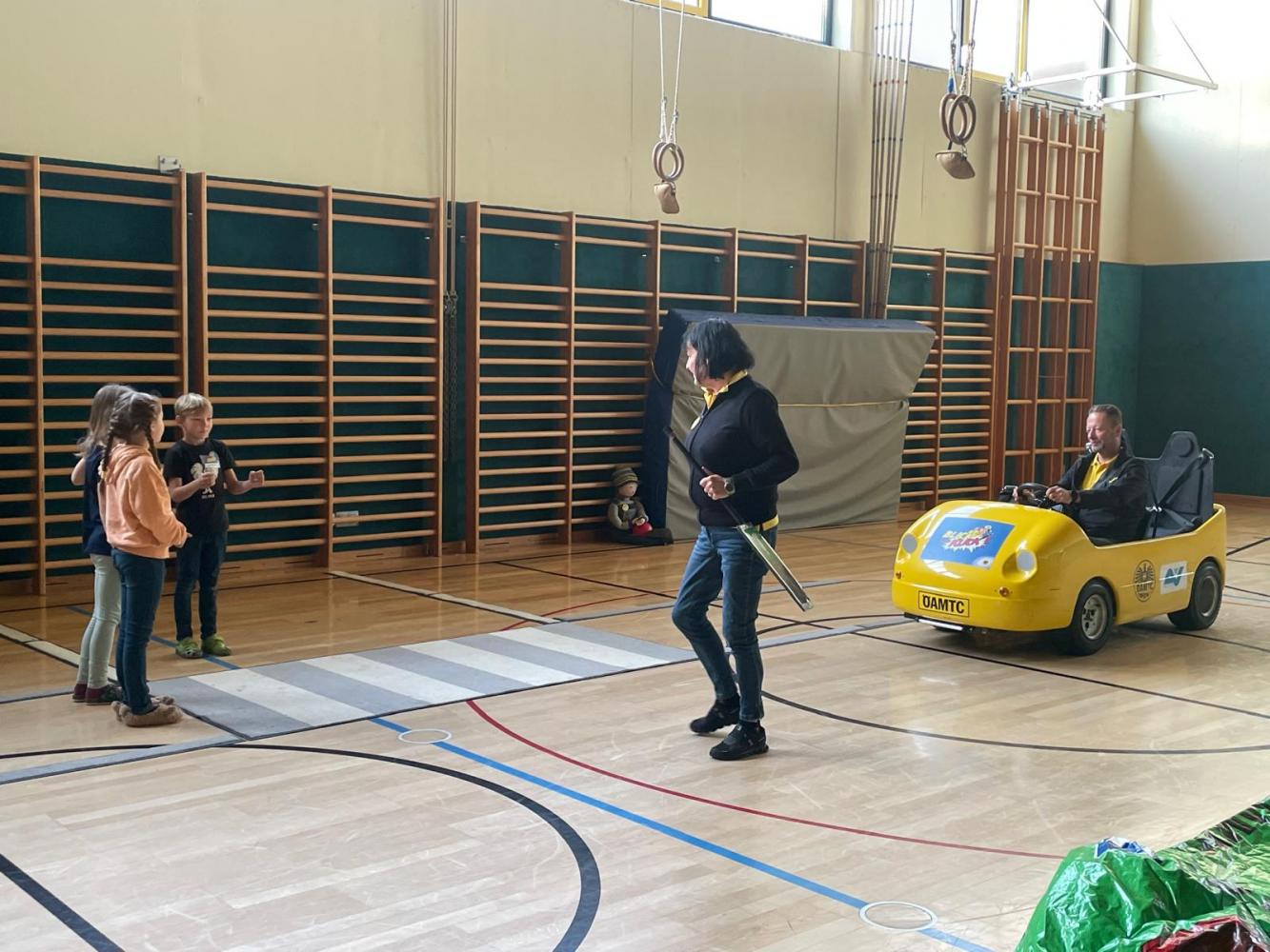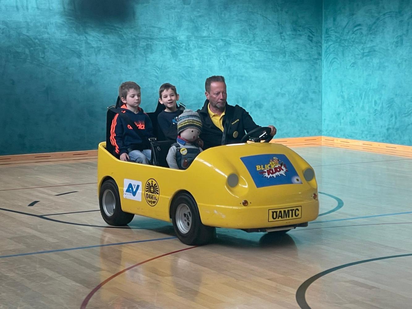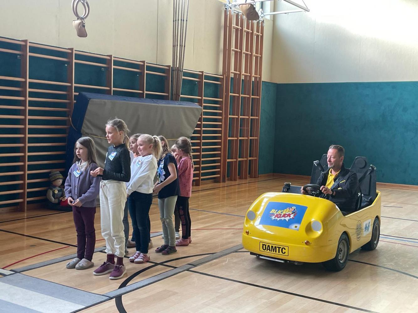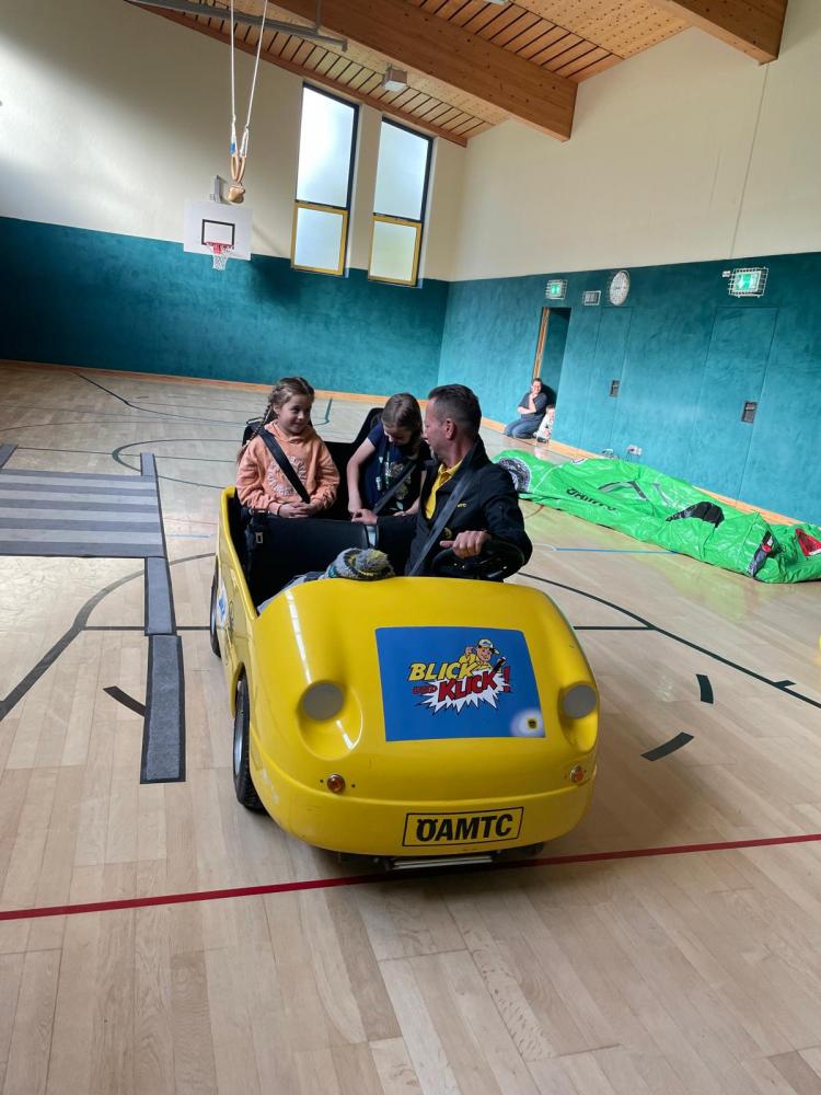 Manfred und Sonja vom ÖAMTC / AUVA besuchten uns am 15.4. mit dem Programm Blick und Klick. Vor allem das Elektroauto, mit dem die Kinder mitfahren durften, war ein voller Erfolg. Nach der tollen Stunde im Sportsaal wussten die Kinder der 1. und 2. Klasse viel darüber, wie man sich im Verkehr verhält.