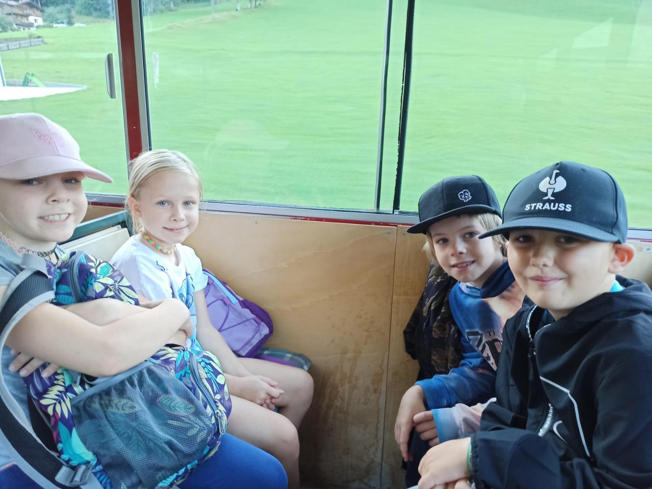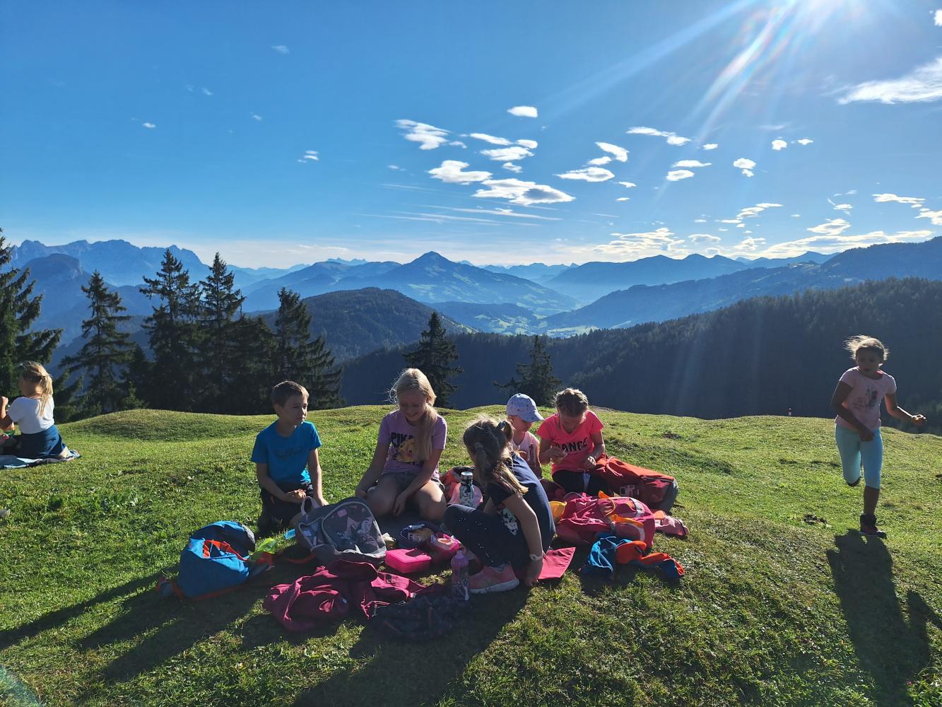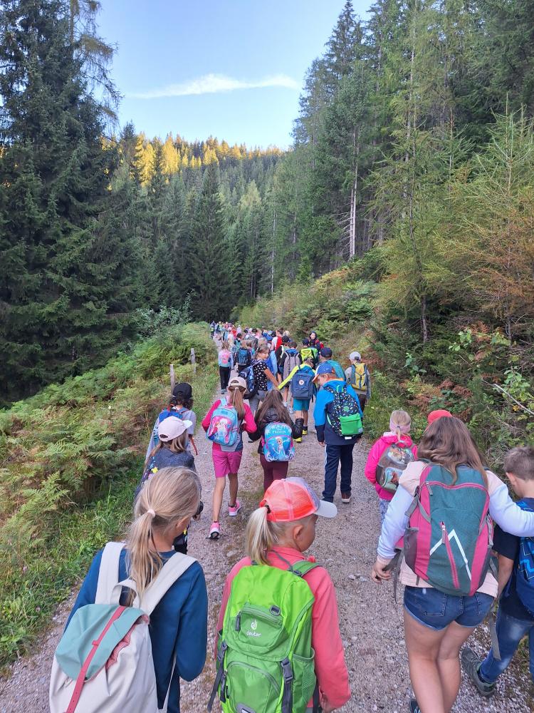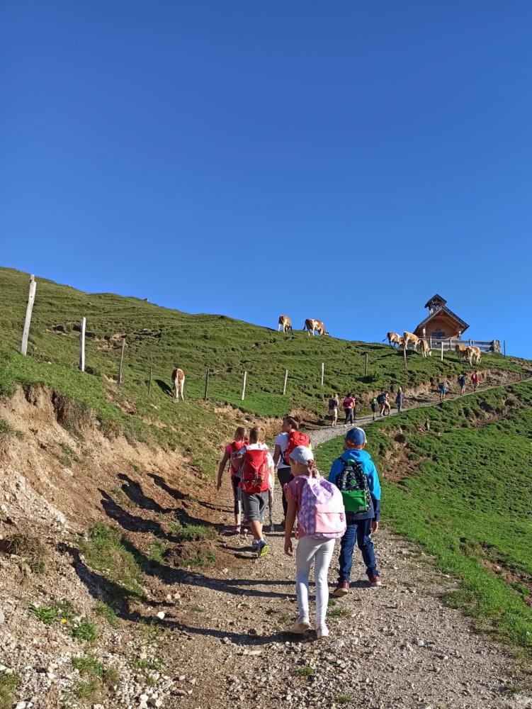 Am 21. September fuhren alle Kinder und die Lehrerinnen unserer Schule mit der Bummelbahn zum Borstadl. Von dort wanderten wir gemütlich zum Kragenjoch. Neben dem Gipfelkreuz verspeisten wir bei strahlendem Sonnenschein unsere köstliche Jause. Auf dem Rückweg kehrten wir bei der Achentalalm ein. Nach einer kurzen Stärkung spazierten wir zurück zum Borstadl, wo Bartl schon auf uns wartete. Unsere sportlichsten Schüler marschierten sogar über den Weg der Lieder zurück zur Schule. Das war ein toller Tag!